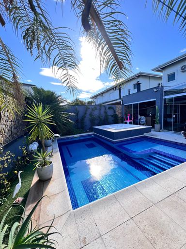 Lindo imóvel com (250) m2 de terreno, (220) m2 de área construída, sala ampla para dois ambientes, sala de jantar, cozinha conceito aberto, área gourmet coberta, (3) dormitórios, sendo (1) suíte, wc social (2) vagas, piscina, jacuzzi, condomínio com lazer. Garantia seguro fiança.